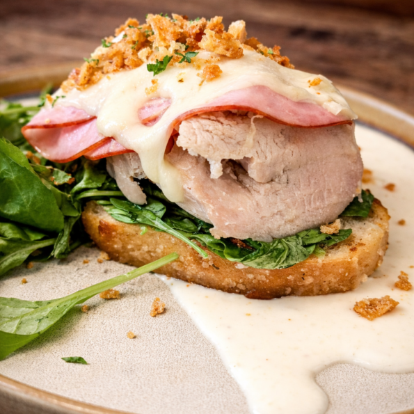 This won't be a traditional cordon bleu. A toasted slice of sourdough will lay on top of a ladle of mornay sauce. Then more mornay on the sourdough, followed by arugula, the turkey, thin-sliced, folded ham, shredded gruyere, a slice of swiss cheese, and then buttery sourdough crumbs. It's like an open-face sandwich but hits all the same notes as cordon bleu only BETTER. My family raved about this one and it will definitely be making it into the rotation when there's turkey (or chicken) breast in the freezer.